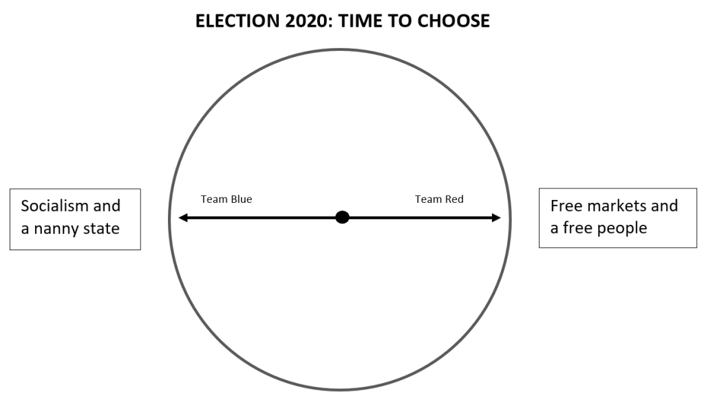 Today, America is at a true crossroads. On almost every issue, Republicans (called “Team Red” herein for simplicity) want to go in one direction, and Democrats (called “Team Blue” herein for simplicity) want us to go precisely, 180 degrees, in the opposite direction.