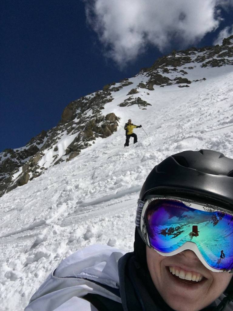 What we had to do was put on skis, go a short distance, take off skis, climb a bit over rocks, put on skis, etc. I didn’t like this at all. Skis should be put on and off somewhere flat, like in a parking lot. Performing the maneuver on this narrow rocky cliff was wrong on so many levels. And most of the levels were beneath us. Everything was beneath us. It wasn’t helping that Kristen kept looking over the edge, the steeper one to the north, that soon we’d have to ski down. There were several other narrow chutes, or “couloirs” as they’re called in Mountain-speak. And she had to look over each one to see how far down it dropped. I knew how far down it dropped. All the way to the bottom. This was the same ridge I’d once looked over the top of, years ago, and nearly required therapy to recover.